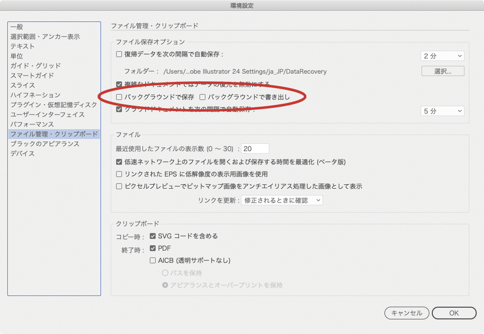 ともかくIllustratorの「バックグラウンドで保存」「バックグラウンドで書き出し」は必ずチェックをはずすよう注意してください。